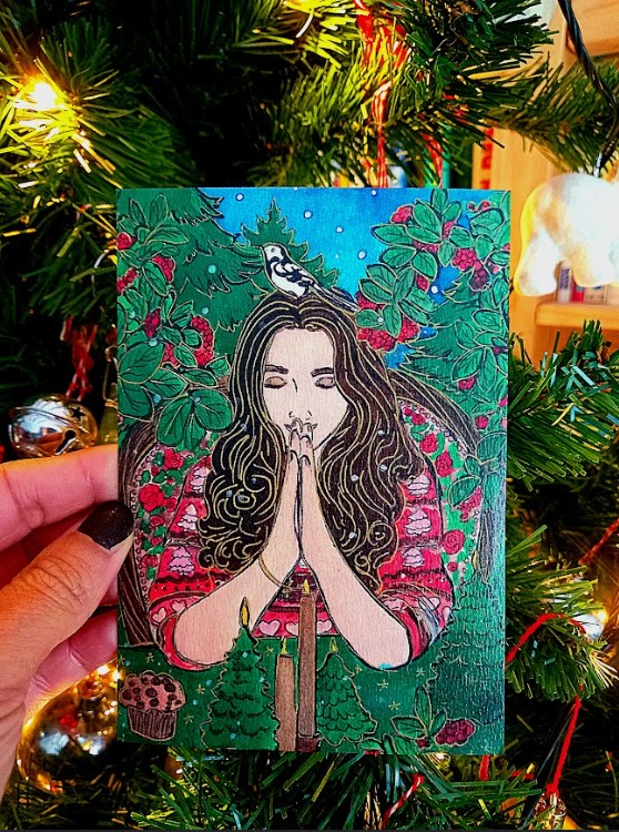 Dans cette illustration, une femme prie devant une table de Noël, et un oiseau s’est posé sur sa tête comme une bénédiction silencieuse. C’est ce moment de recueillement que j’ai voulu saisir, cette prière du cœur que j’ai trouvée dans le silence finlandais. L’oiseau, ce colocataire écureuil ou cet animal sauvage qui n’a pas peur, représente cette connexion avec la nature que la Finlande m’a offerte. La table de Noël symbolise le foyer retrouvé, pas celui où je suis née, mais celui où mon cœur a trouvé sa paix. C’est une image de gratitude, de contemplation, de cette spiritualité tranquille qui n’a pas de vocabulaire pour lui rendre grâce. C’est en regardant le jardin par la fenêtre de ma grand mère en décembre que ses sentiments mitigés ont germé dans mon cœur.