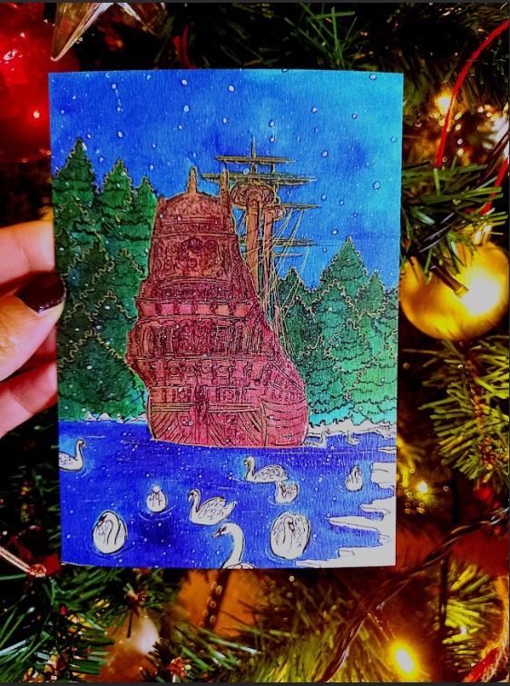 Le Vasa est remonté du fond de la mer. L’Hermione a été reconstruite planche par planche. Et moi, des années plus tard, debout dans la neige de Stockholm, j’ai compris que ces histoires ne parlaient pas que de bateaux. Elles parlaient de nous. De notre capacité à croire. De notre obstination à préserver ce qui est beau. De notre refus d’accepter que les légendes doivent rester mortes. J’ai dessiné le Vasa comme je l’ai ressenti : majestueux et fragile à la fois, flottant doucement sur l’eau dans la neige qui tombe. Des cygnes glissent autour de lui, témoins silencieux de sa résurrection. Dans mon illustration, le gallion n’est pas qu’un bateau, c’est une des milliers de légendes qui refusent de mourir, un rêve qui flotte encore malgré les siècles, que l’on continue à transmettre même quelques instants. Les reflets mordorés du bois patiné se mêlent au blanc de la neige, et chaque ornement sculpté raconte une histoire d’obstination humaine. »