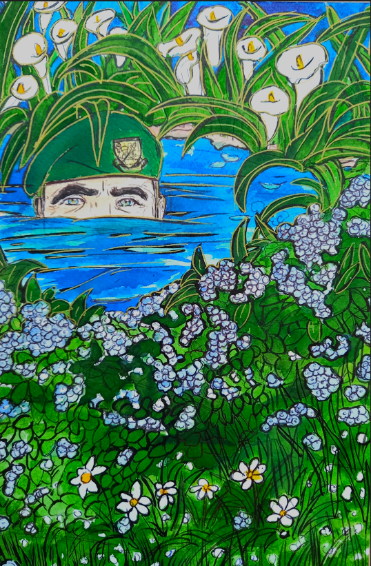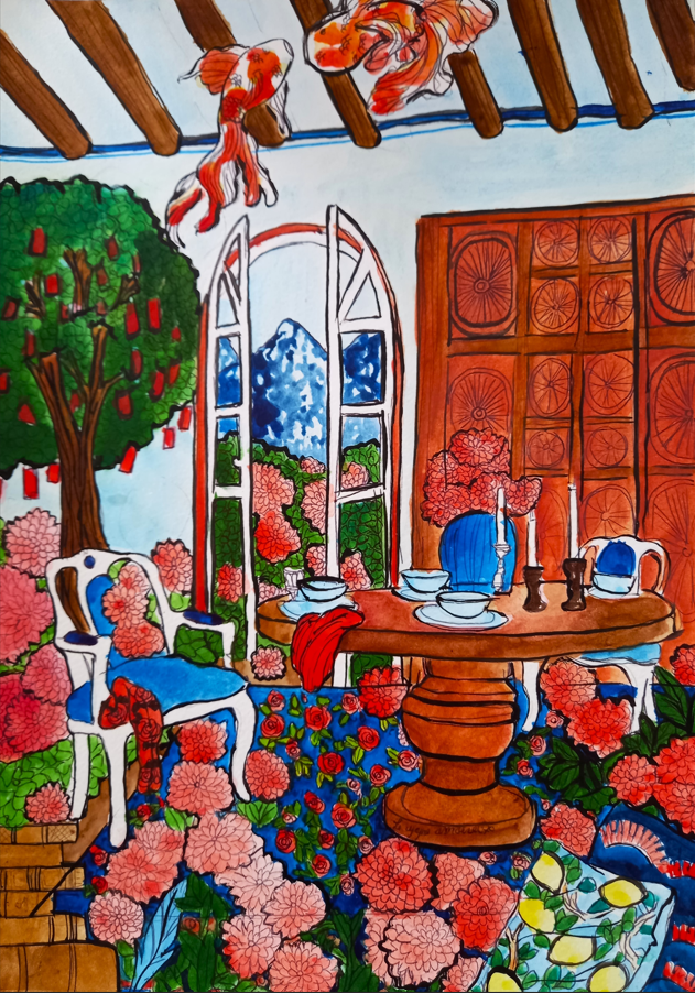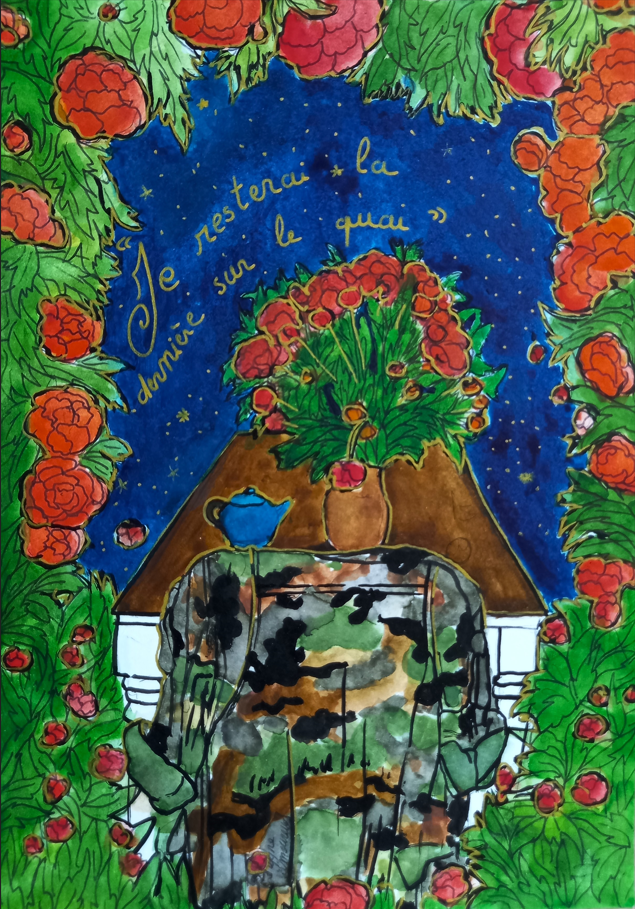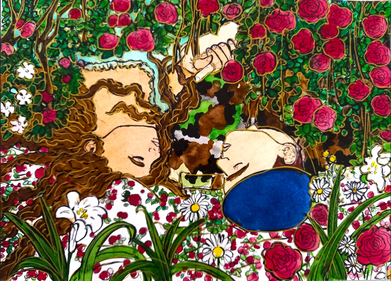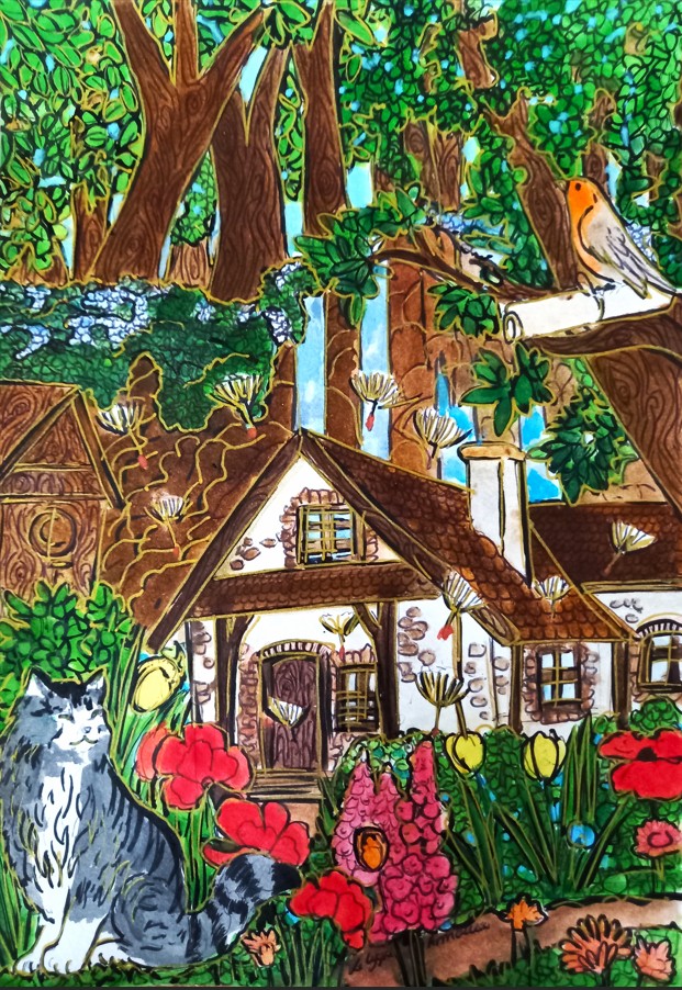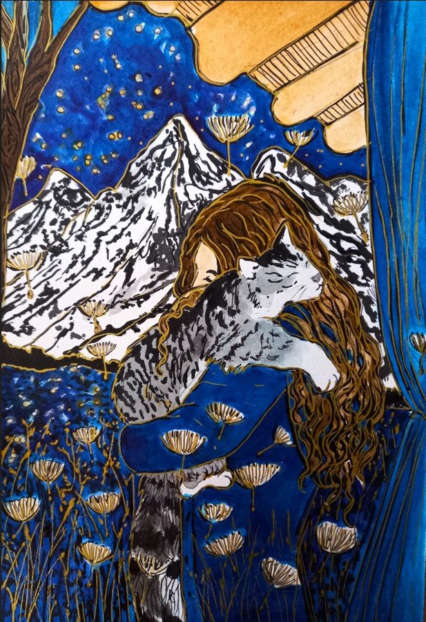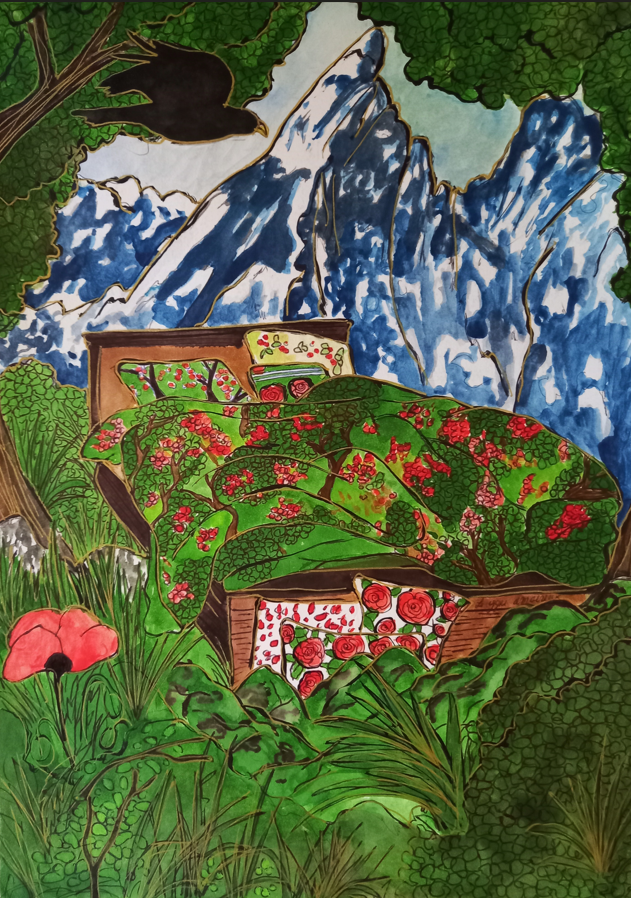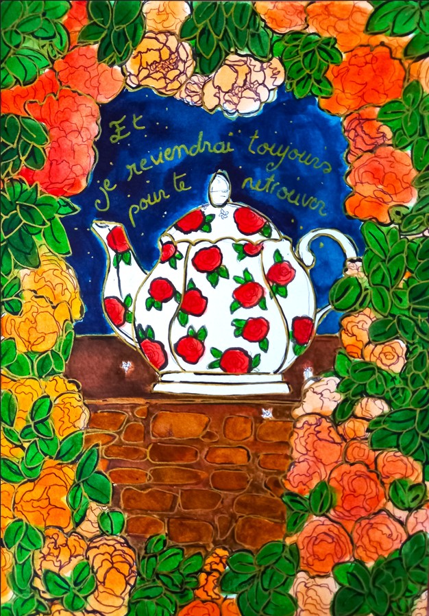 « Que ce soit, à travers les paysages d’été, la lumière qui effleure les montagnes et les lacs tranquilles, je la voulais miroir d’un couple en chemin vers l’harmonie. Chaque toile est une invitation à voir l’invisible : le frémissement silencieux des âmes qui se réconcilient, les gestes qui se font plus tendres, le souffle léger d’un avenir retrouvé. L’amour, tel un jardin qui fleurit au printemps, renaît à son propre rythme, sans hâte, sans bruit.«